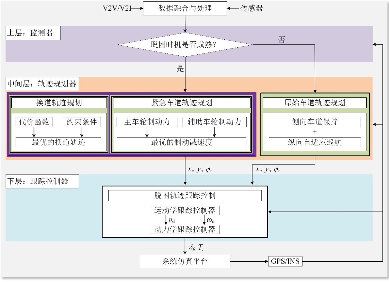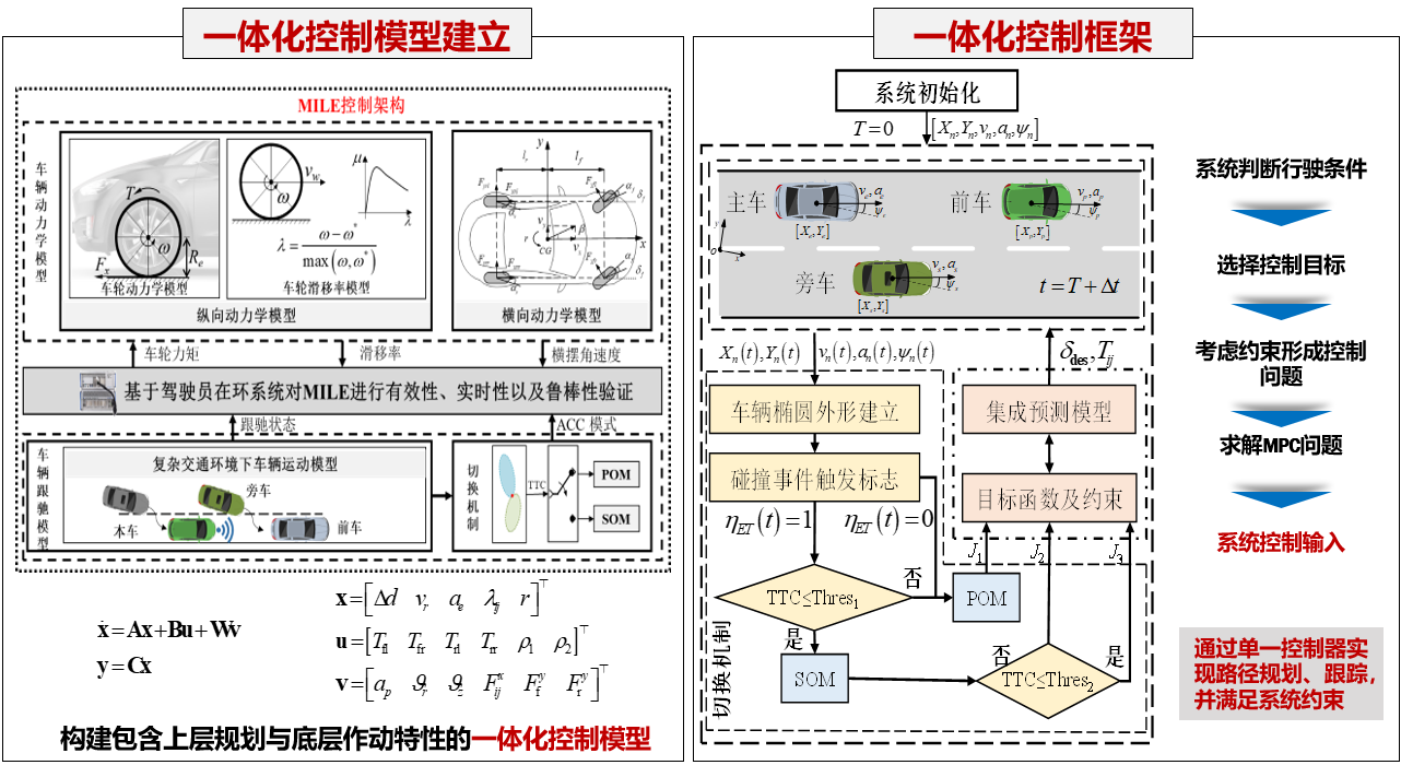 开展考虑动力学约束的规划-控制集成控制框架、基于多行驶目标切换的模型预测控制策略以及复杂场景下差异化行驶目标量化评价方法,形成了复杂场景下的规划-跟踪集成一体化控制方法。
