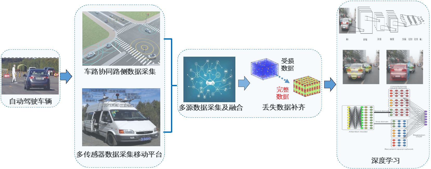 研究对复杂场景下智能车辆行驶状态数据异源、异质和异步的特点,采用车路协同路侧数据采集和多传感器数据采集移动平台相结合的多源数据获取方式;采用深度学习对多源异构、异质和异步数据进行融合处理。