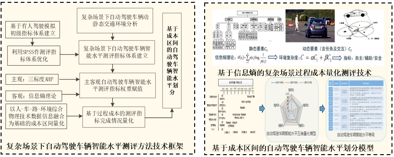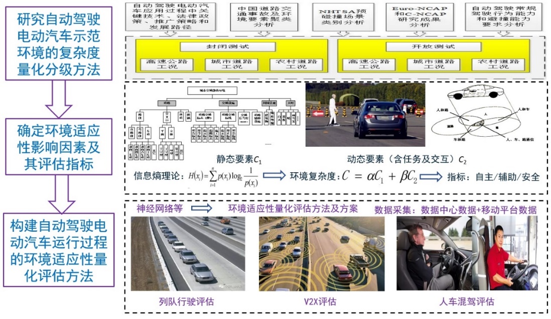研究智能车辆环境复杂度量化分级方法,确定环境适应性影响因素及其评估指标,建立智能车辆运行全过程复杂环境适应性量化评估模型,构建智能车辆环境适应性量化评估方法。