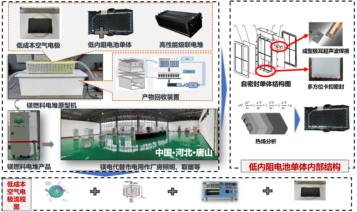 针对镁金属燃料电池空气电极成本高无法量产,且其内部物理、化学内阻过高,导致放电效率低下以及产物无法回收等问题,重点开展了无贵金属空气电极量产制备技术、低内阻高效电池单体技术以及高性能电堆级联技术方面的研究,实现了镁金属空气电池低成本空气电击的批量化生产,通过低内阻电池单体的高效级联,形成了以高性能镁金属燃料电池为基础的储能装备平台。