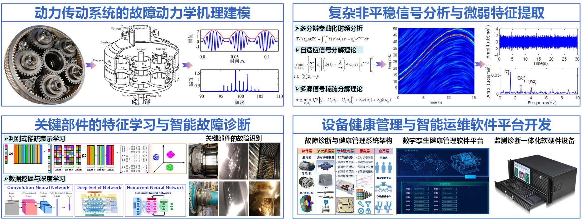 瞄准车辆装备信息化与智能化需求,开展了车辆动力传动系统的故障诊断与智能运维理论及技术研究,研究工作涵盖了动力传动系统的故障动力学机理建模、复杂非平稳信号分析与微弱特征提取、关键部件的特征学习与智能故障诊断等,开发了典型机电设备的健康管理与智能运维软硬件平台等。
