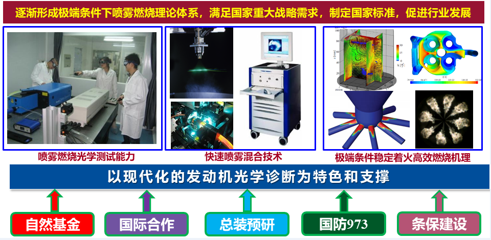 发动机研究所目前拥有发动机单缸机和整机试验台共9个,转鼓及排放测试试验台1 个,另外还有燃烧激光测试系统、PIV测试系统、高速摄影测试系统、燃油泵及供油规律测试系统、稳流气道试验系统、定容弹及光学发动机、非常规排气污染物测试设备等多种测试条件,总价值约5千余万元。近年来,研究所承担了国家 863、973、国防预研、发动机型号产品研发、重大技术攻关、自然科学基金等国家级项目;与企业广泛开展技术合作,为长安汽车开发出中国第一款阿特金森循环汽油机、中国第一台氢内燃机和氢内燃机轿车,为云内动力开发出系列柴油机;作为国家环保部内燃机排放控制与法规制定的主要依托单位之一,主持或参与了14项国家和地方机动车排放法规的制定;形成了基于参数化设计的预测设计方法和知识产权体系,取得多项科研重大成果,近5年授权国家发明专利70余项,发表学术论文300余篇,获国家科技进步二等奖1项,国防科技进步特等奖1项,省部级及学会奖10余项。发动机研究所承担多门本科生、研究生课程的教学工作,包括发动机原理、燃烧学、发动机测试技术、发动机性能仿真等。