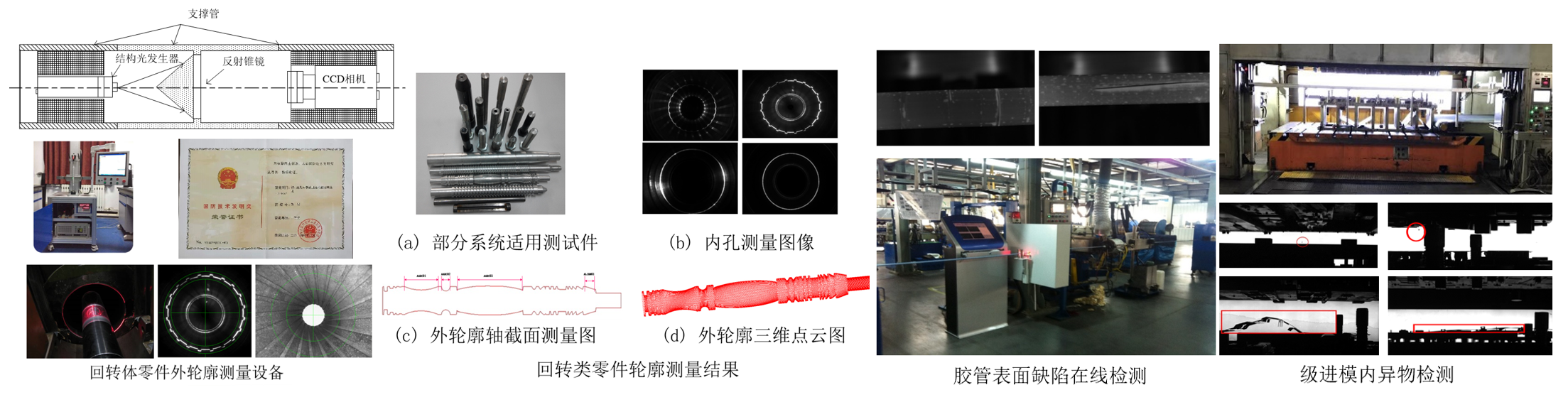 在装备预研、国家“智能制造综合标准化与新模式应用项目”专项等项目资助下,突破了结构光轮廓测量、疵病特征参数测量、高速连续生产产品在线缺陷视觉检测和强振动模式下的异常机器视觉监测等关键核心技术,成功研制出了结构光回转体轮廓测量仪(国防发明二等奖),基于机器视觉的汽车胶管生产线在线检测系统和冲压级进模在线监测系统,实现了检测自动化,填补国内空白。