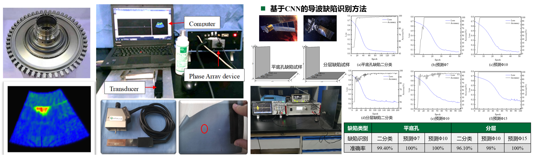 在装备重点预研、国防技术基础等项目资助下,自主研制了导波阵列成像检测系统,突破了小型化柔性导波阵列传感器、导波模态控制、缺陷信号识别和二维曲面成像等关键技术,研制了超声导波阵列检测仪,应用于航空发动机叶片缺陷检测、碳纤维曲面构件检测、飞机机翼结冰检测等。