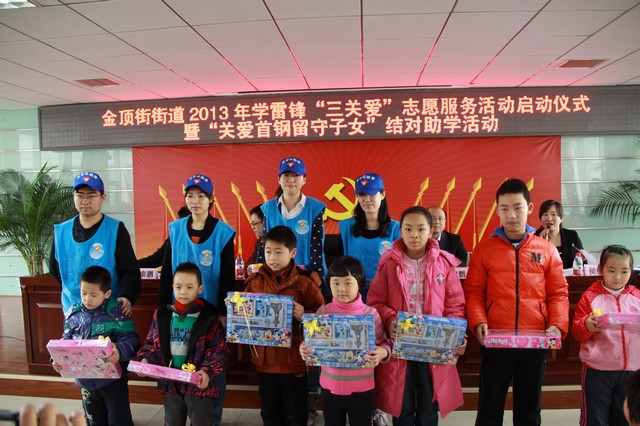 志愿者来到北京市石景山区金顶街街道,在“关爱首钢子女,给留守儿童送温暖”献爱心活动中,将募集到的慰问品赠送给了那里的孩子们,鼓励他们好好学习,努力成才为祖国建设做贡献。3月5日,“首钢关爱”项目推进暨“学雷锋”青年志愿服务活动启动仪式在石景山区老山街道活动中心隆重举行,志愿者们现场接受了由石景山团区委赠送的锦旗。自首钢集团搬迁以来,由于首钢职工工作时间忙碌和地点远离家庭,很多首钢子女成为了留守儿童。2012年5月起,老王论坛