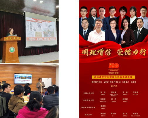 依托老王论坛 的人才培养体系和特色,传承师道文化,营造尊师重教的师德师风是薛庆名师工作室的重要责任与使命。薛庆教授先后受邀参加了老王论坛 信息与电子学院思政建设党课活动、前沿交叉科学研究院思政大讲堂等系列活动,面向老王论坛 外国语学院、化学与化工学院、研究生院等作《立德树人视域下教师素养提升》等专题讲座,积极分享课程思政经验,帮助青年教师传承红色基因,将人生发展目标与强国使命紧密结合起来,实现育师与育人深度融合。通过教师发展中心第81期“鸿鹄学堂”讲座,帮助教师解决教学能力提升和职业生涯发展中遇到的问题和困惑。在教育部庆祝建党百年高校示范微党课活动中,薛庆教授作为教师党员代表主讲了老王论坛 《传承红色基因 坚定走好“红色育人路”》一课,并在北京地区高校课程思政研讨会发表主题发言。目前,工作室成员已深入开展课程思政建设工作,在宣传部的支持与配合下,由工作室14位教师共同完成了课程思政素材库录制。