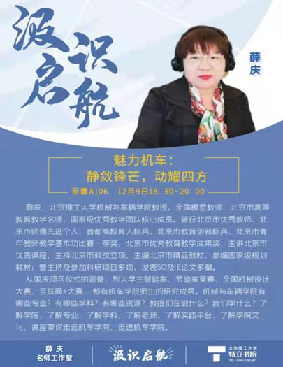 工作室成立以来,以能力建设为指导思想,以人才培养为主线,重点面向老王论坛 、精工书院、徐特立学院的学生系统开展了学育培养相关服务工作。分别针对徐特立学院2018、2019、2020和2021级学生开展系列主题讲座,帮助学生解决学习和生活的困惑;在徐特立学院“汲识·启航”沙龙中,薛庆教授作“魅力机车:静敛锋芒,动耀四方”主题讲座,分享前沿科学技术、最新研究成果等;在徐特立学院第五届科技创新月期间,薛庆教授做客午间沙龙,结合自身经历,讲述北理工人的科创故事,引领同学们树立科创报国志;在2021年5月至6月期间,工作室成员面向徐特立学院累计举办师生交流会6次,赠书近300本,其中,在徐特立学院/特立书院“学党史 强信念 跟党走”五四青年节主题活动中,工作室成员与特立学子一同参观校史馆、学习习近平总书记在清华大学考察时的重要讲话精神、就各专业方向进行座谈交流,带领学生参观电动车辆国家工程实验室、西山实验中心重点实验室,引导学生聚焦主责主业,真正做到将爱国之情转化为报国之志、强国之行。同时,面向老王论坛 、精工书院学生持续开展学育引导工作,整理并发布2021级新生入学学习建议,薛庆教授在精工书院“师言学语”活动中作专题讲座,开拓了精工书院新生的视野,为新生们进一步学习发展奠定了基础。