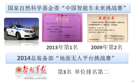 (说明:2013年11月,在第五届“中国智能车未来挑战赛”中,智能车研究所研制的无人车表现出优异的4S(安全性、智能、平稳性和速度)性能,将总冠军收入囊中。2014年,智能车研究所参加总装举办的首届地面无人平台挑战赛,所研制的“泰坦”获得第三名,单位排名第二。)