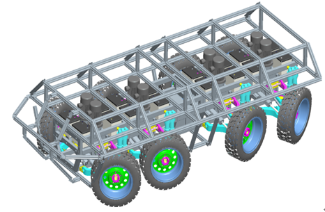 (说明:汽车总体及底盘控制团队开发了液压-全轮转向执行器、电动-全轮转向执行器与全轮转向控制系统,显著减小了越野车辆的最小转弯半径,同时大幅提高了轮式越野车辆的操纵稳定性。)