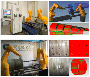在国家“高档数控机床与基础制造装备”重大专项等资助下,攻克了定位精度控制、轨迹规划、扫查点空间位置信息同步采集等多项关键技术,形成了针对回转构件和复杂曲面复合材料等复杂构件的大型复合材料复杂构件的双机械手超声检测系统。