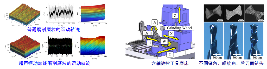 (4)先进磨削与刀具制造:主要开展了蓝宝石单晶等光学晶体超声振动磨削、光学微纳结构微成形磨削、硬脆材料磨削SPH仿真、高强度钢齿轮精密磨削、超硬合金微细铣钻刀具与精密刃磨、微细刀具高频脉冲磁场定位强化、超声振动微细钻削/铣削、微小复杂曲面五轴加工与刀具适配性技术等研究。