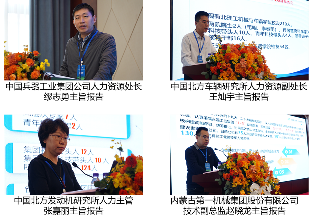 大会主旨报告环节由机械工程学科、装甲车辆工程本科专业学科专业责任教授刘辉教授主持。装甲车辆工程专业教授、北京高校青年教学名师魏巍教授作专业建设主旨报告,介绍了装甲车辆工程专业建设情况以及两个专业未来建设思路和发展方向;中国兵器工业集团公司人力资源处缪志勇处长作了关于兵器工业集团人才建设现状与需求的主旨报告,中国汽车工程学会人才工作委员会名誉主任委员张宁作了新能源汽车人才现状与需求分析的主旨报告,中国北方车辆研究所、中国北方发动机研究所、内蒙古第一机械集团股份有限公司等国内装甲车辆领域头部企业和研究所的人力资源代表,分别作行业主旨报告,分析了装甲车辆工程毕业生就业后人才成长路径和企业培养模式,提出了专业人才培养需求。