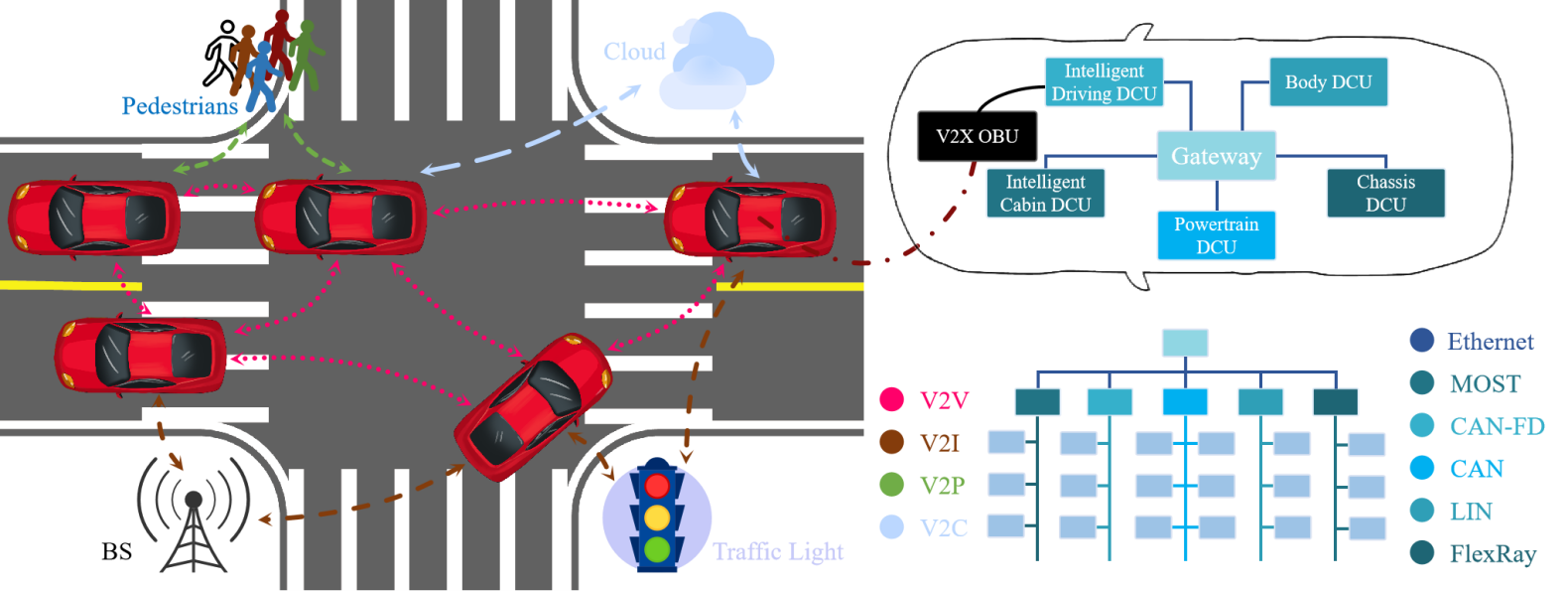 文章围绕车辆通信与智能网联化控制中的核心问题——通信与控制集成,针对车内网络通信与车辆自主运动控制集成、车际网络通信与车辆协同运动控制集成,以及车内-车际复合通信与车群运动控制集成等方面开展系统性综述研究。在此基础上,提出了未来先进车内网络、车际网络及其新型组网架构的技术构想,凝练了现有研究中尚未解决的科学问题,并对未来面临的技术挑战开展了讨论。