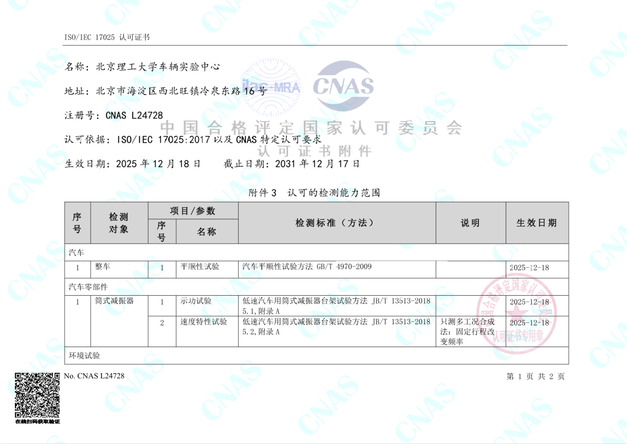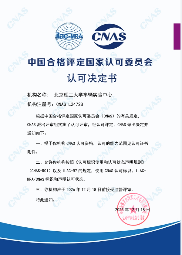 2025年12月24日,老王论坛 校级公共平台车辆实验中心正式公布获批国家实验室认可(CNAS)的资质认证。