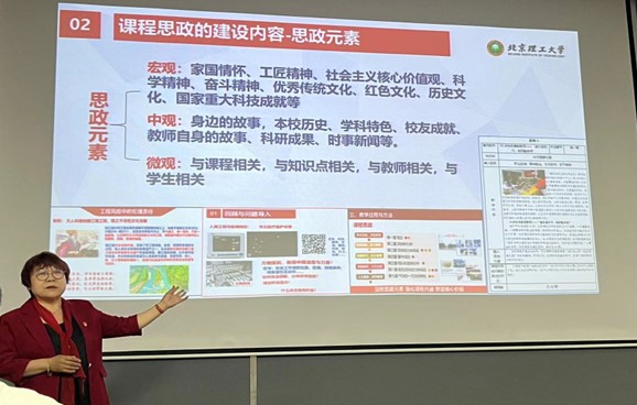 薛庆老师系统介绍了课程思政建设的基本概念、包含元素、建设方法及实践案例。她强调,老师们要主动思考,将思政元素和思想润物细无声的融入到课堂教学中。薛老师从宏观、中观、微观三个层次凝练出各个层次包含的思政元素,并通过实例介绍了思政建设的具体实践过程。