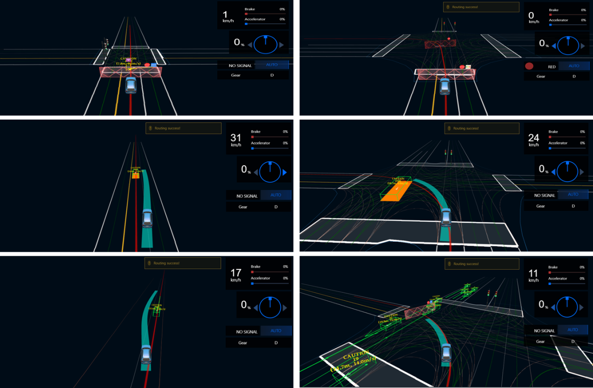全国总决赛比赛场景包括人行道避让、障碍物避让、慢速车绕行、左转待行、左转障碍物绕行、无保护左转共六种典型城市自动驾驶场景,参赛选手需要在规定时间内按照场景要求完成既定任务。自动驾驶车辆行驶过程中,需遵守交通规则,同时也需要考虑行驶过程的舒适度与通行效率,最后基于任务完成情况于任务完成时间进行评分与排名。
