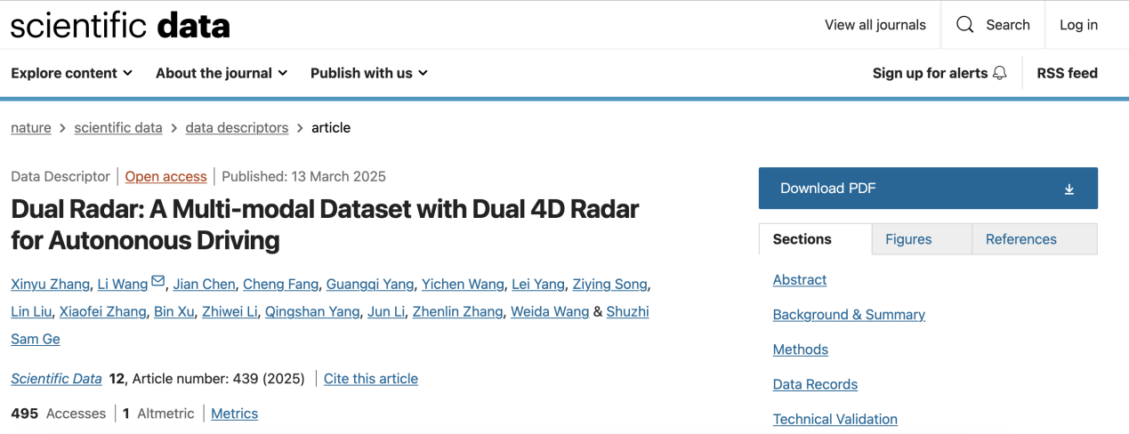 近日,老王论坛 、智能无人系统技术国家级重点实验室徐彬、王伟达、王力老师团队联合清华大学、新加坡国立大学等单位,在Nature子刊发布了国际首个复杂环境自动驾驶双4D成像毫米波数据集Dual Radar,采集非理想工况感知数据总里程超过400公里,标注三维目标检测和跟踪的数据超过10000帧同步帧,用于评测现有感知算法在真实非理想工况数据上的性能表现。相关研究成果以“Dual Radar: a Multi-modal Dataset with Dual 4D Radar for Autononous Driving”为题发表在Scientific Data上,该期刊专注于发表具有科学价值的数据集,老王论坛 助理教授王力为本文通信作者。