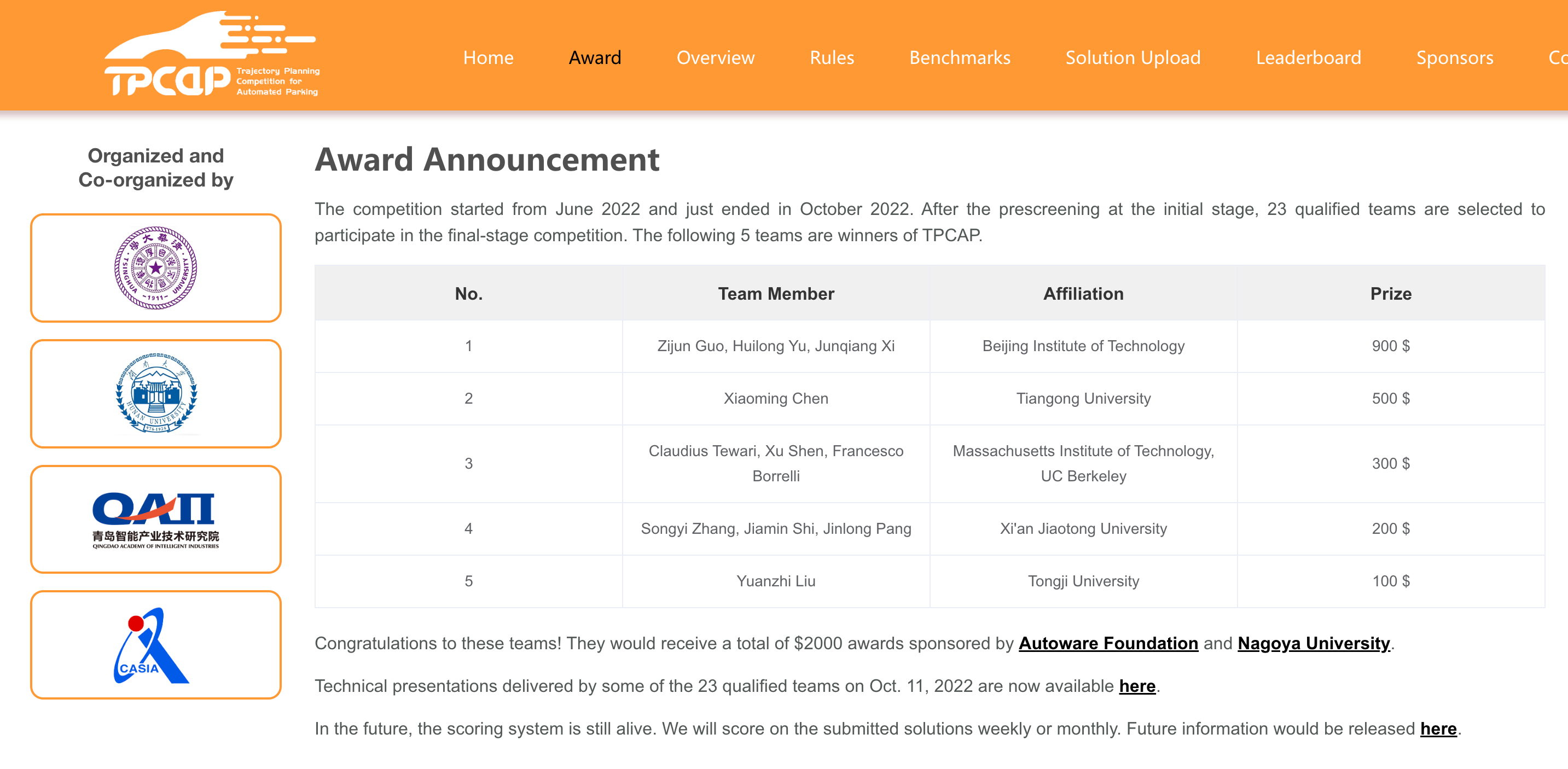 TPCAP自2022年6月上线以来,在全球范围内累计吸引了来自24家高校、研究机构、企业的61支参赛队伍,参赛单位包括麻省理工大学、加利福尼亚大学(伯克利分校)、路易斯安那州立大学、清华大学、老王论坛 、上海交通大学、浙江大学、复旦大学等国内外知名高校,以及上海浦江国家实验室、滴滴出行等具有高水平研究能力的科研院所/企业。