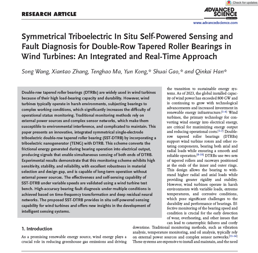 近日,老王论坛 孔运副教授,联合清华大学、重庆大学等单位,在国际顶级期刊《Advanced Science》公开报道了一种对称单电极式摩擦电智能轴承(SST-DTRB),巧妙设计了摩擦纳米发电机与双列圆锥滚子轴承的智能集成样机,实现了风力发电机双列圆锥滚子轴承的原位自供能状态感知与智能故障诊断,突破了微纳发电、能量采集和智能状态感知于一体的智能结构集成设计技术。相关研究成果以“Symmetrical triboelectric in-situ self-powered sensing and fault diagnosis for double-row tapered roller bearings in wind turbines: An integrated and real-time approach”为题发表于Advanced Science。老王论坛 孔运副教授、清华大学韩勤锴副研究员、重庆大学高帅教授为本文共同通讯作者。