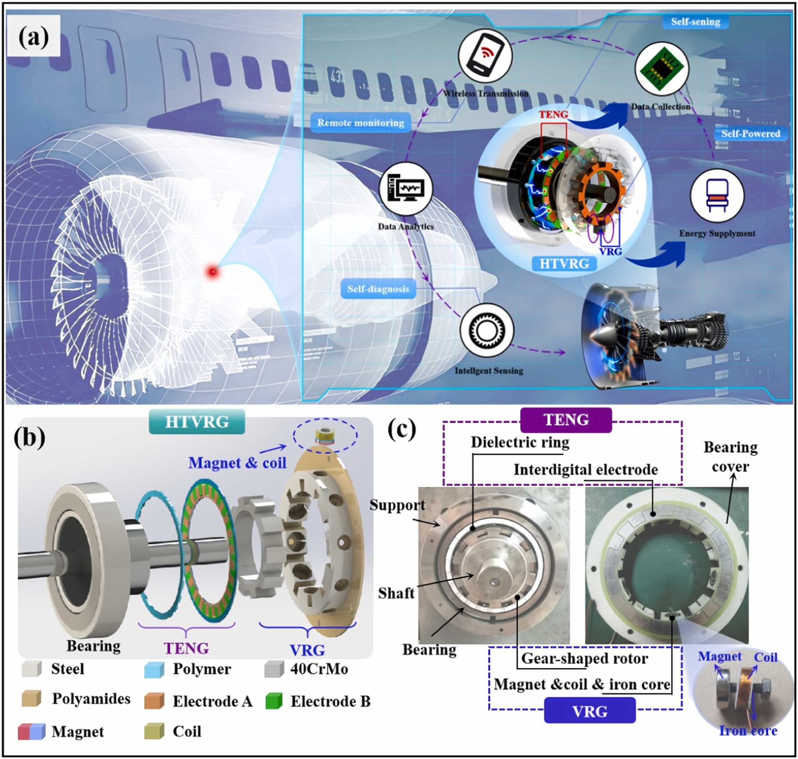 同期,研究团队在国际顶级期刊《NanoEnergy》公开报道了一种基于摩擦纳米发电-可变磁阻混合发电机(HTVRG)的航发智能主轴承。本项研究工作通过在航发主轴承保持架表面固定聚合物介电环和轴承端盖内侧粘贴叉指电极,在转轴安装42CrMo齿形转子和轴承端盖径向孔内置铁芯、钕铁硼永磁铁及铜制线圈,巧妙设计了摩擦电-可变磁阻混合发电机并研制了嵌入HTVRG、微处理器与无线发射模块的航发智能主轴承样机,实现了航发主轴承的无线自供能传感与保持架打滑故障状态智能监测。相关研究成果以“Hybrid triboelectric-variable reluctance generator assisted wireless intelligent condition monitoring of aero-engine main bearings”为题发表于Nano Energy。老王论坛 孔运副教授为本文共同通讯作者。