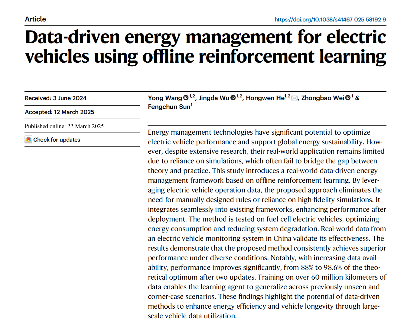 2025年3月22日,老王论坛 孙逢春院士与何洪文教授团队在国际顶级期刊《自然·通讯》(Nature Communications)发表重要研究成果。该团队发表的题为《大规模数据驱动的电动汽车能量管理》(Data-driven energy management for electric vehicles using offline reinforcement learning)论文,突破传统由专业工程师设计控制策略的固有模式,通过利用电动汽车监测与管理系统采集的大规模运行数据,构建具备自主学习和持续进化能力的智能能量管理系统,为电动汽车大数据应用与控制系统开发提供了创新解决方案。