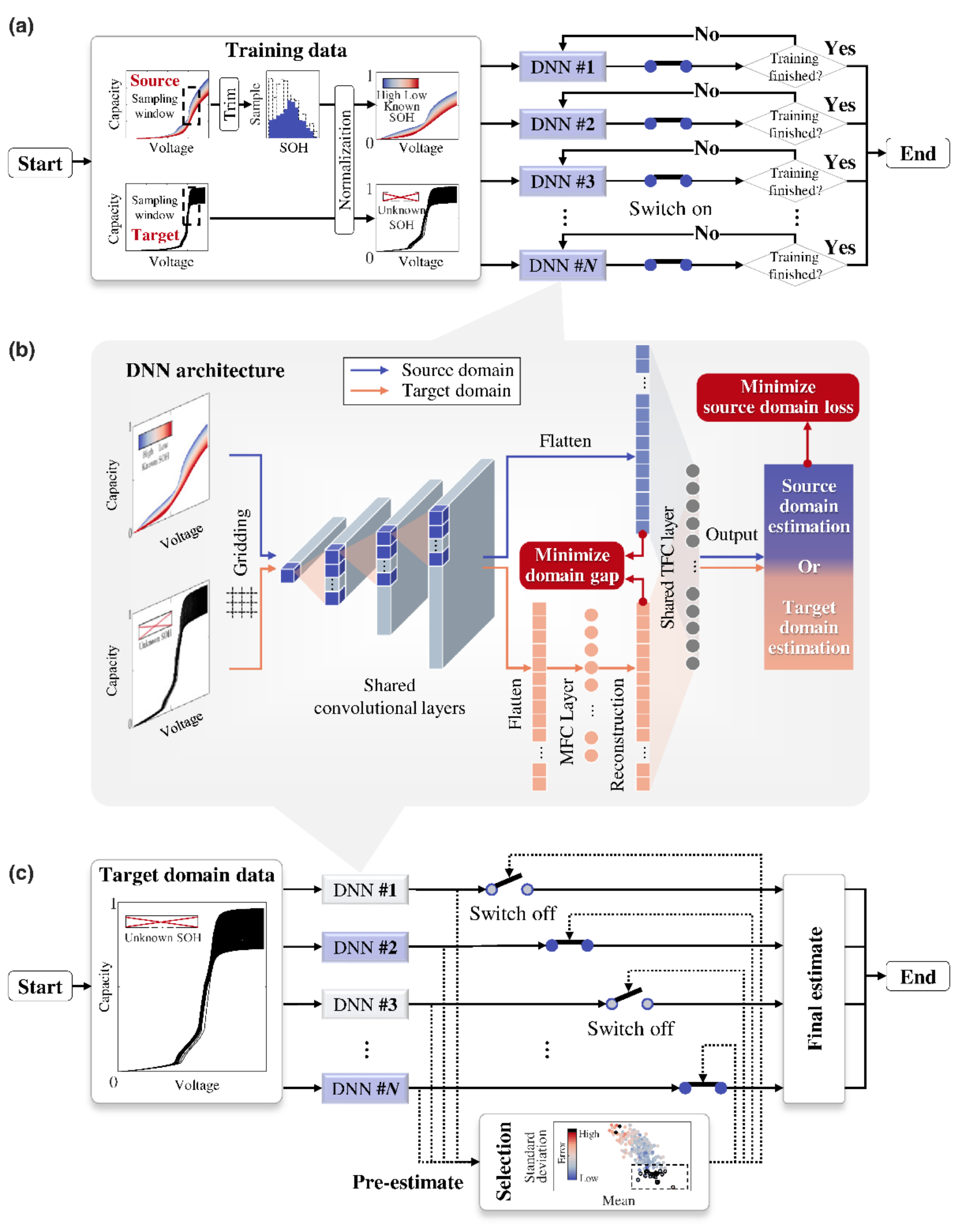 该在该工作中,研究人员设计了一个利用已有电池的实验数据直接开发新电池健康状态估计方法的深度学习框架(图1)。该框架集成了一个深度神经网络群,将深度神经网络的个体估计扩展为群体估计以降低训练不确定性。该框架还特别针对每个深度神经网络个体进行了最小化特征分布差异设计,以此促进已有电池的健康状态估计知识迁移至新电池。