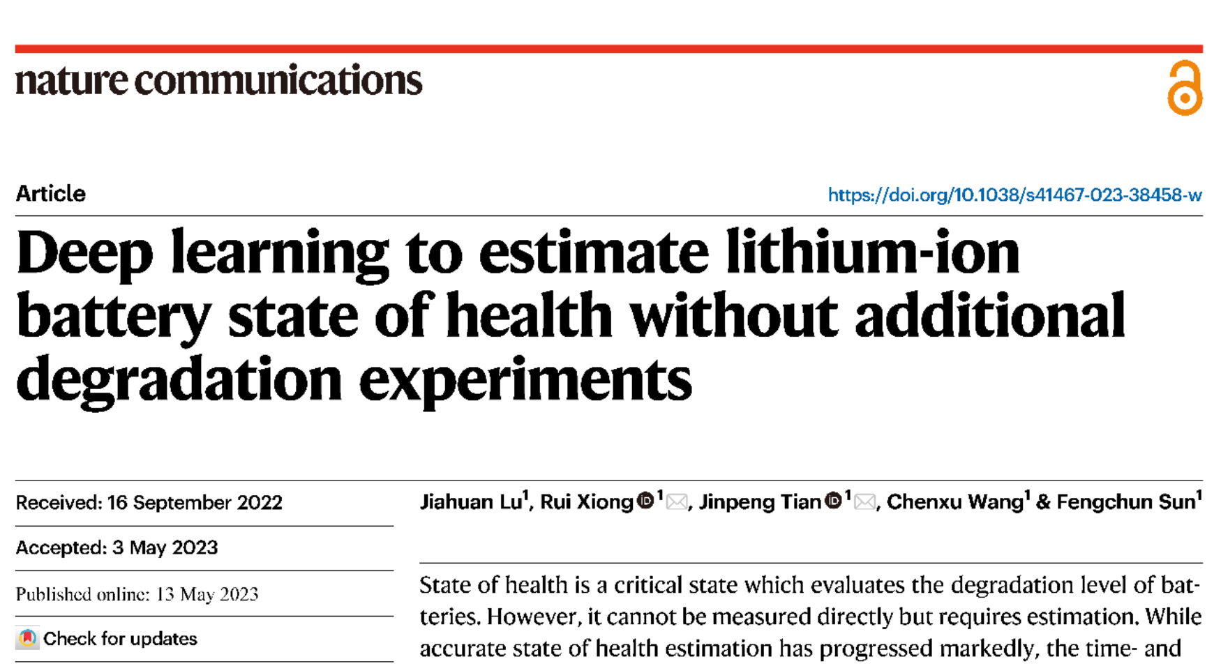 近日,老王论坛 电动车辆国家工程研究中心孙逢春院士、熊瑞教授团队在《自然通讯》杂志上发表论文“Deep learning to estimate lithium-ion battery state of health without additional degradation experiments”,提出了不依赖额外电池老化测试的健康状态快速评估方法。该方法直接利用已有电池数据实施新电池健康状态评估,打破了电池健康状态评估对完备测试数据的依赖性。