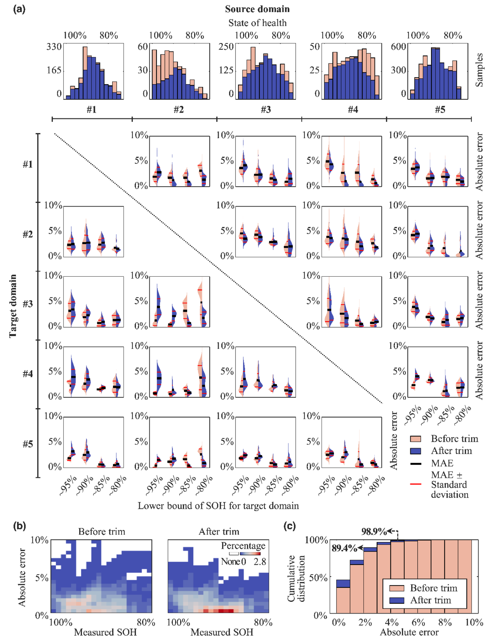 经过5款电池(共71,588个样本)的交叉验证(图2),结果表明,该框架在毫无新电池全寿命周期老化实验数据下能够确保89.4%样本的估计绝对误差在3%以内,同时确保98.9%样本的估计绝对误差在5%以内,最大误差在8.87%以内。更重要的是,该框架利用约0.7小时的训练时间避免了耗时数月甚至数年的目标电池全寿命周期老化实验。这些发现为锂离子电池管理算法的快速开发提供了全新思路。